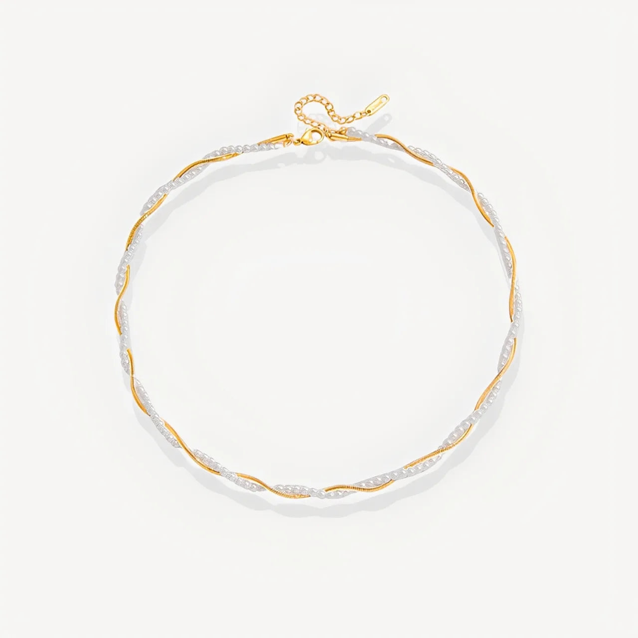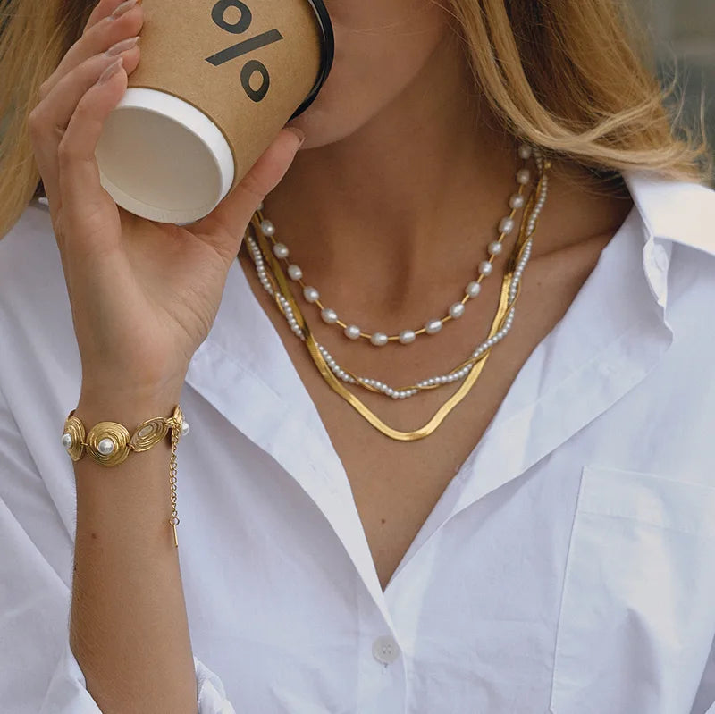 Eine elegante Halskette, die klassische Eleganz mit modernem Stil verbindet. Mit einer zart gedrehten Perle an einer 18-karätig vergoldeten Schlangenkette aus Edelstahl ist dieses Schmuckstück langlebig, hypoallergen und perfekt für den Alltag. Vielseitig und zeitlos, kann es solo für einen minimalistischen Look oder in Kombination mit anderem Schmuck für ein schickes Statement getragen werden.