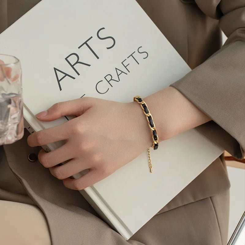 Ulippa's Braided Gold and Black Chain Leather Bracelet is more than just an accessory; it’s a statement of elegance and modern design. Whether worn for a special occasion or to elevate your everyday attire, this bracelet promises to enhance your look with its refined design and captivating beauty. Treat yourself or someone special to this beautifully crafted piece and embrace the timeless charm of braided chain and leather jewelry.