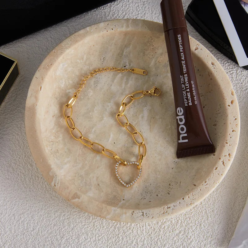 Straal van elegantie en verfijning met de Hollow Heart-armband. Deze armband is gemaakt van 18-karaats verguld roestvrij staal en heeft een hol hartontwerp, versierd met sprankelende kristallen, voor een oogverblindende, luxueuze uitstraling.