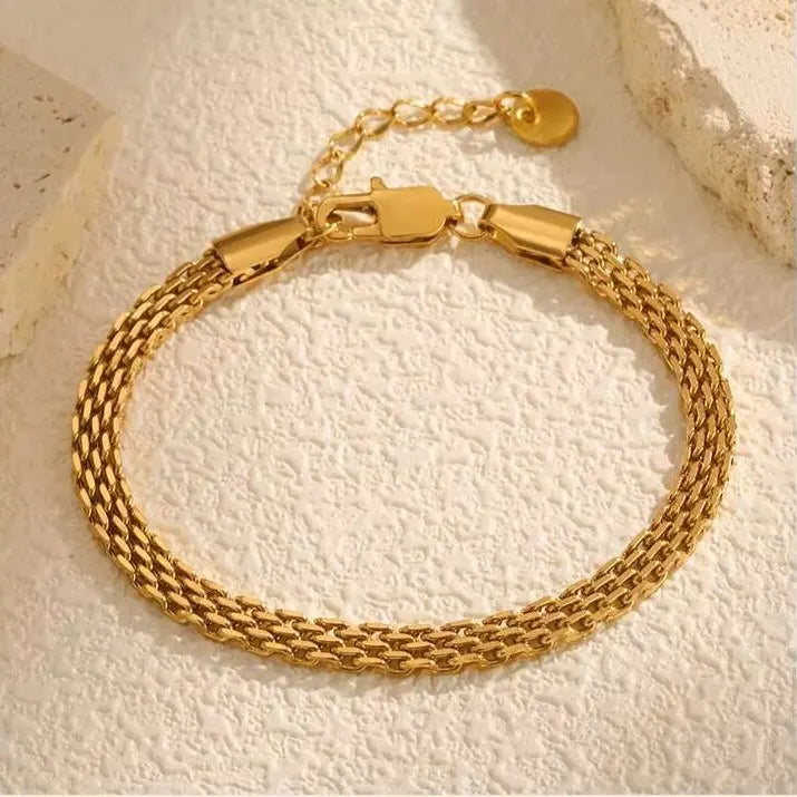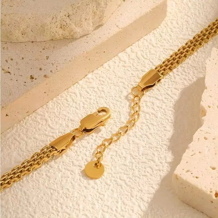 De Ulippa Lattice-armband combineert modern design met tijdloze elegantie. Hij is gemaakt van duurzaam roestvrij staal met 18-karaats gouden plating en heeft een verstelbare pasvorm, perfect om solo te dragen of in laagjes voor een opvallende statement.