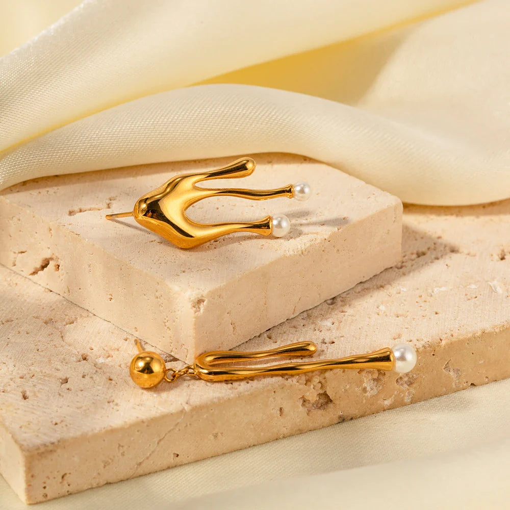 18k Dainty Asymmetrical Melted Gold Pearl Earrings