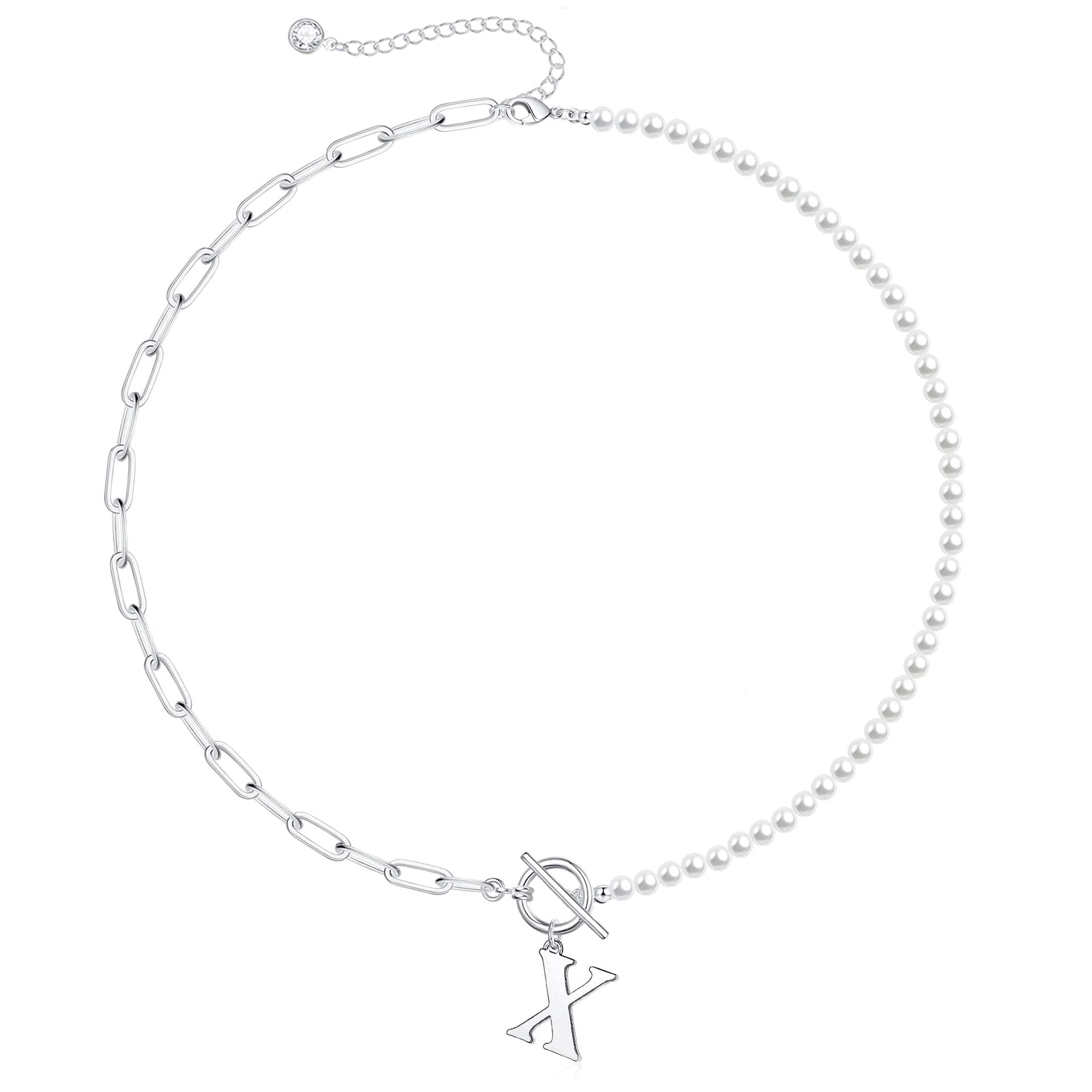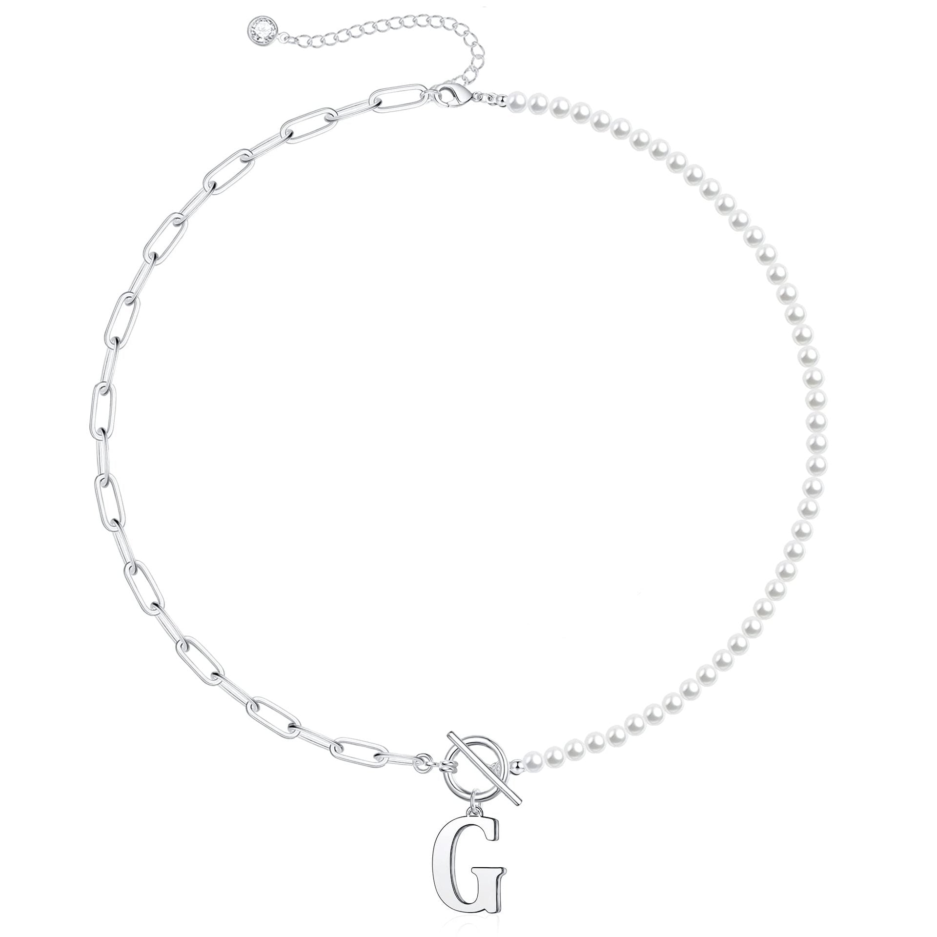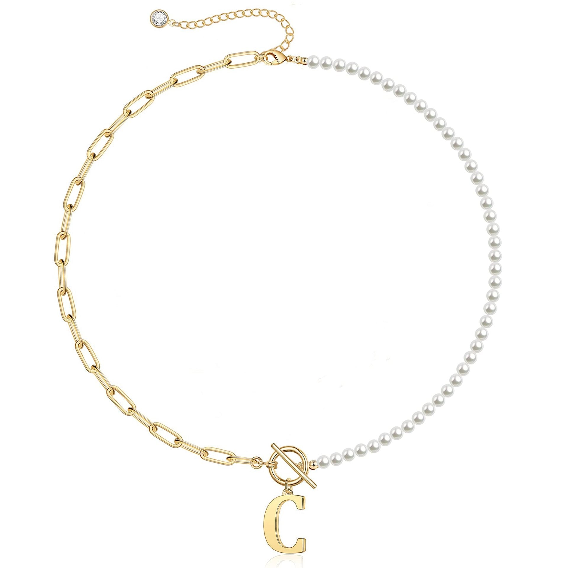 - Style: This elegant necklace features a split design, with one half showcasing lustrous pearls and the other a dainty paperclip chain. At the center, a circle bar clasp adds a touch of sophistication, accompanied by a serif-font initial charm for a personalized and refined look. The balance between the classic pearls and modern paperclip chain makes this necklace perfect for both everyday wear and special occasions.
